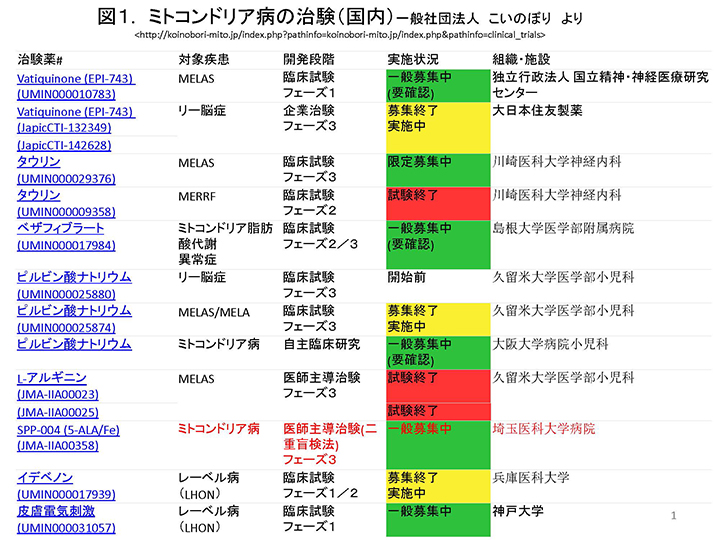 以上5-ALAは、これまで対症療法しかなかったミトコンドリア病に初めて根本治療が行えるようになるものと期待できる薬剤です。この他にも多数の治験が走っていることは申し上げましたが、これら治験に最も必要なことは、患者さん1人1人のご協力です。患者会への参加は勿論、登録(レジストリー)制度への1人でも多くの方のご協力をお願いし、稿の結びと致します。