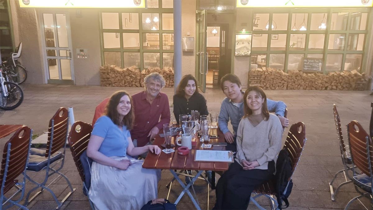 コロナ禍の海外留学ということもあり、コロナ前とはだいぶ異なる留学体験をしていると思いますので、少しここで紹介させていただきたいと思います。当初の留学開始時期は2020年9月を予定しておりましたが、ドイツ国内での新型コロナウイルス感染拡大のため、2か月遅れの11月にようやく渡独することができました。しかしながら、夏に一旦落ち着いた感染が10月頃から再度悪化、11月からは再ロックダウンとなり、全てのレストランが持ち帰り営業のみとなっていました。12月まではラボに毎日行くことができましたが、ドイツ国内の感染者数が毎日3万人まで増えたため、2021年1月下旬からはラボのルールも厳しくなり在宅ワークが中心となり、ミーティングも全てオンラインで行っています。2020年12月から開始されたCOVID-19ワクチンのおかげか、2021年4月下旬より新規感染者数が減少傾向となり、ミュンヘンでは各種制限の緩和が開始、5月下旬になりようやくボスのProkisch博士とビアガーデンで一緒にお食事をすることができました(写真)。ラボワークも、もう少しで順調に進めることができる状況になりそうです。