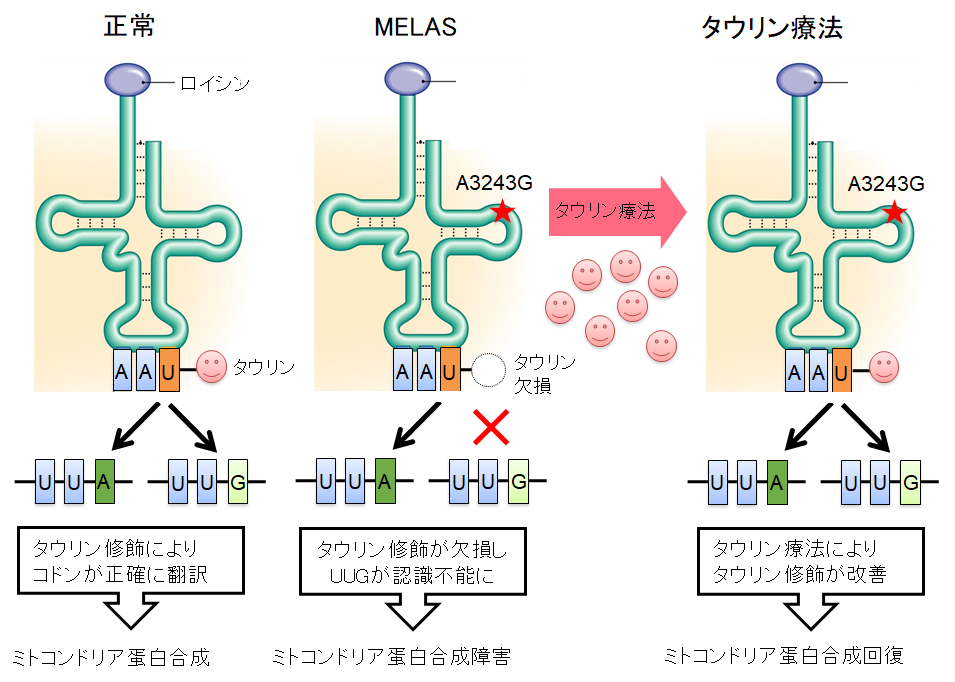 2000年から2002年にかけて東京大学の鈴木勉先生や日本医科大学の太田成男先生らによりタウリンとミトコンドリア病との関連を示す画期的な発見がありました2)3)。ご存じのようにDNAに書かれている遺伝暗号は一旦メッセンジャーRNA(mRNA)に転写された後で、タンパク質に翻訳されます。この翻訳を仲介するのが運搬RNA(tRNA)で、mRNA上の3文字の塩基配列(コドン)に対応したアミノ酸を運搬してきます。このコドンを相補的に認識するアンチコドンの部分にタウリンが付加されていて、MELASというミトコンドリア病ではこのタウリン修飾が欠損するため、特定のコドンが正確に認識されなくなることがわかりました。こうなるとタンパク質が正常に合成できなくなり、ミトコンドリアの機能が低下してしまいます。
