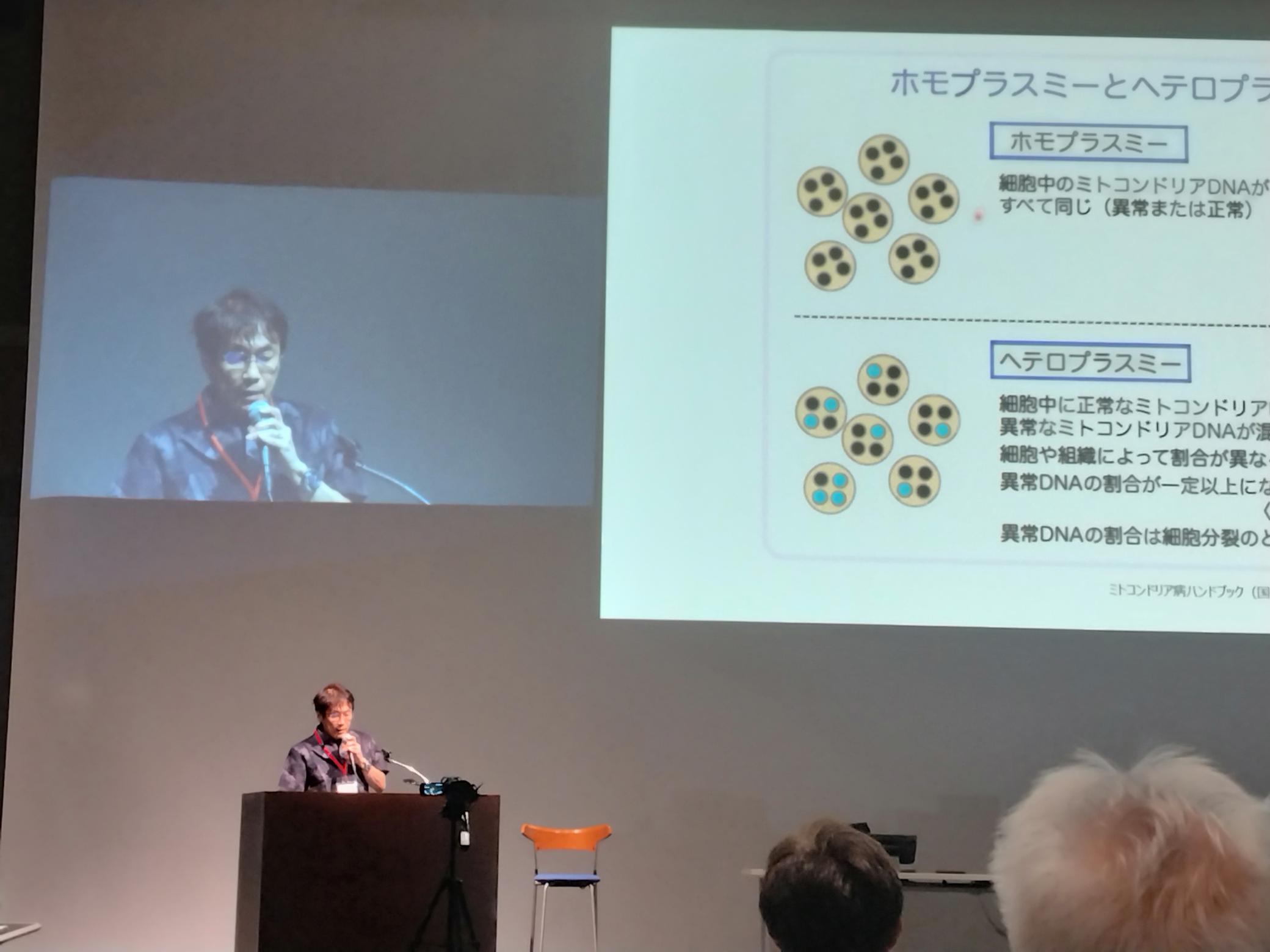 研究者からは、ミトコンドリア病研究の最先端から「ミトコンドリア病最前線」「ミトコンドリア病をおこす遺伝子」と題しての発表があり、また、治療開発の現状から「5-ALA」