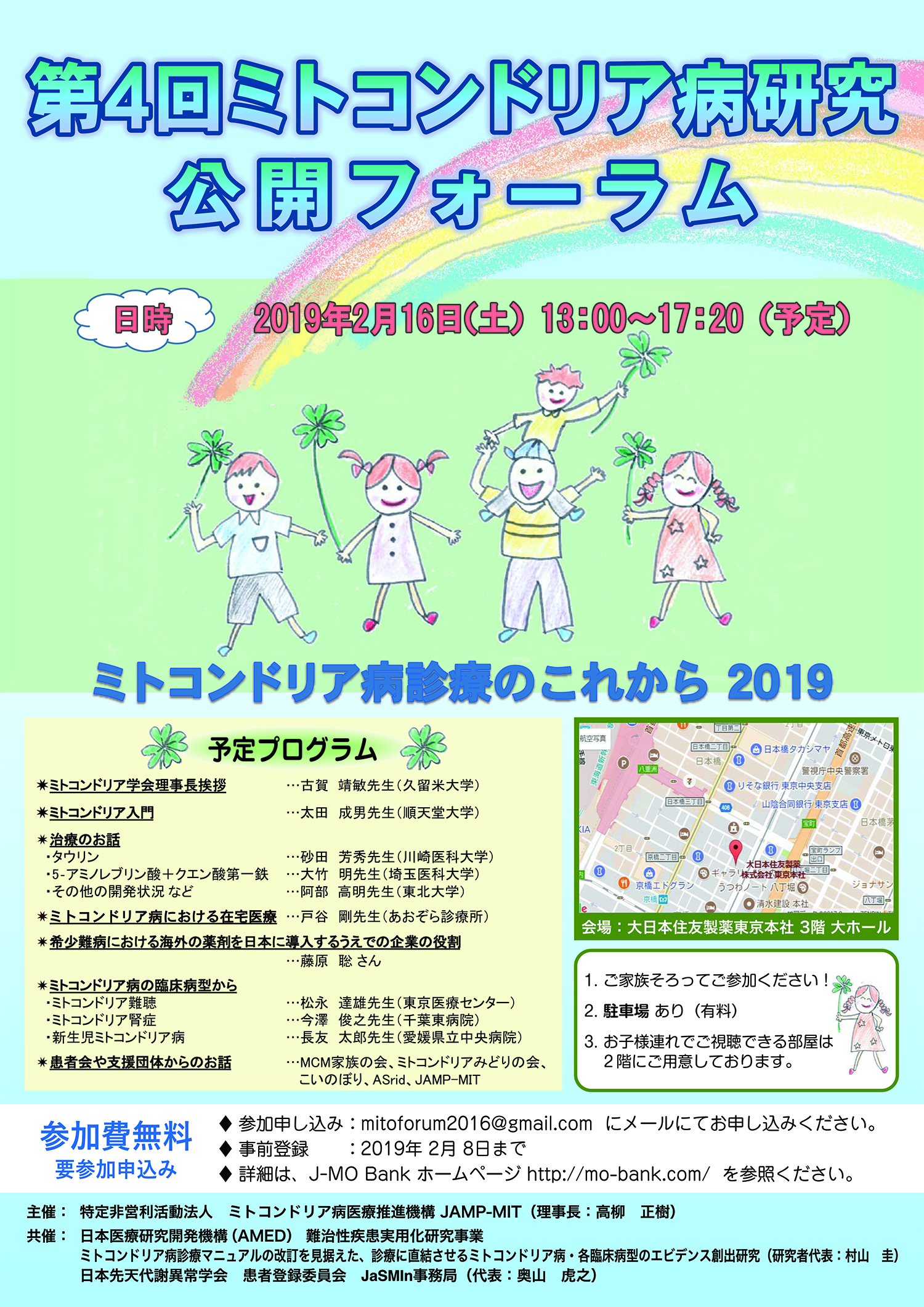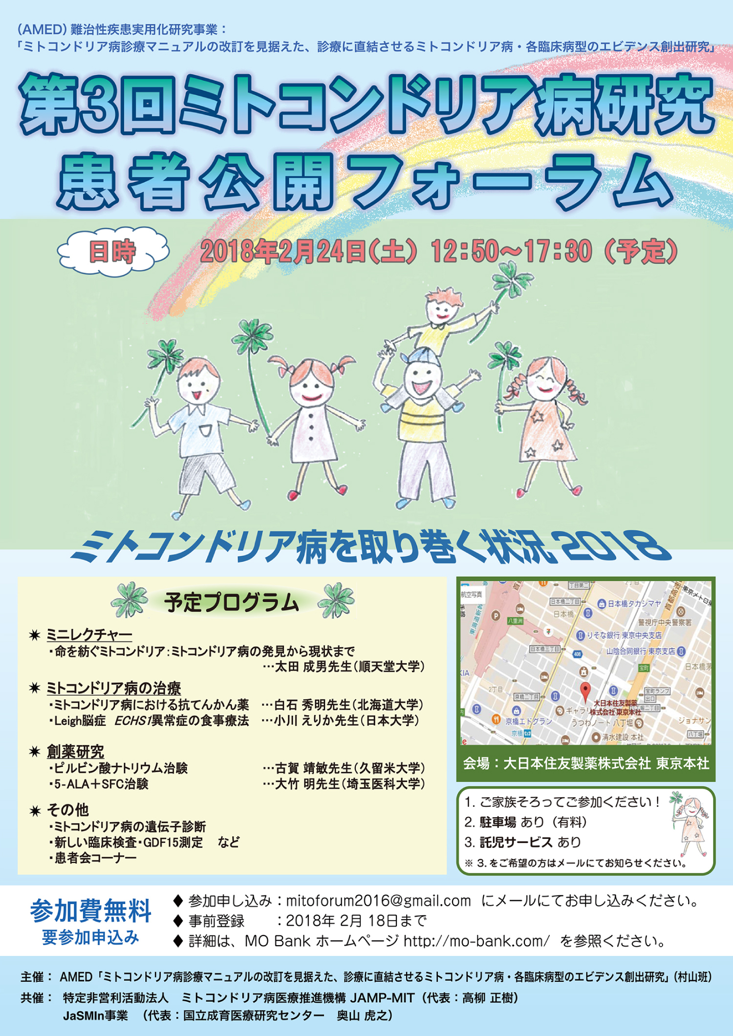 AMED村山斑 第3回ミトコンドリア病研究患者公開フォーラム(当機構共催)が患者様、ご家族の方々、医療従事者、研究者等約150名の参加を得て「大日本住友製薬株式会社 東京本社大会議室」にて盛大に開催されました。