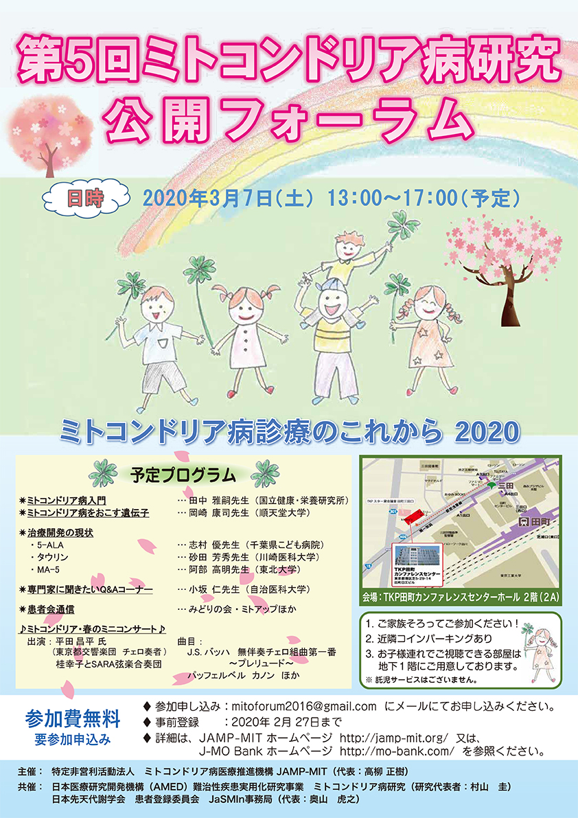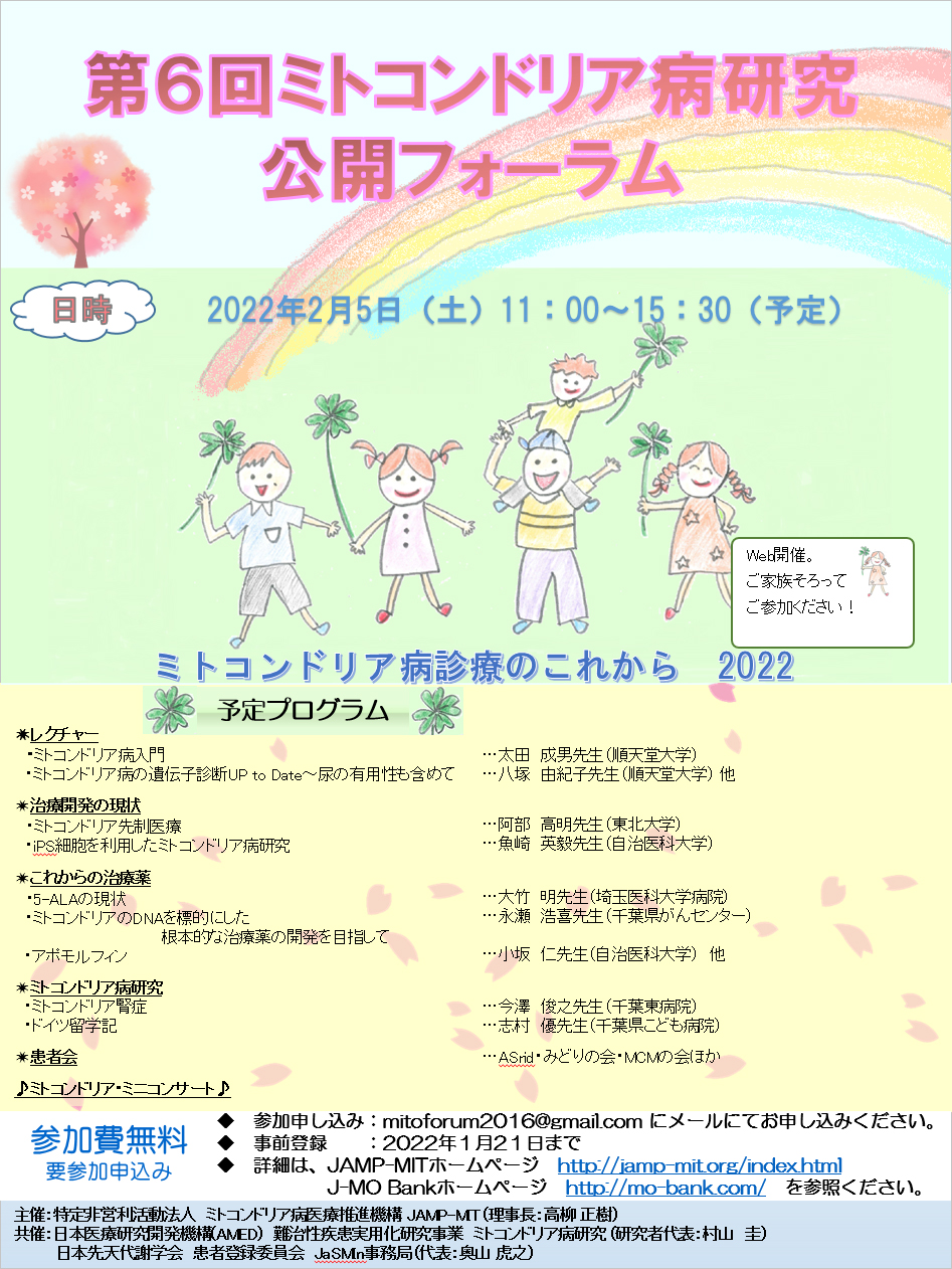 延期しました「ミトコンドリア病研究公開フォーラム」については、Web開催とし、出演者はリモート出演も検討しております。